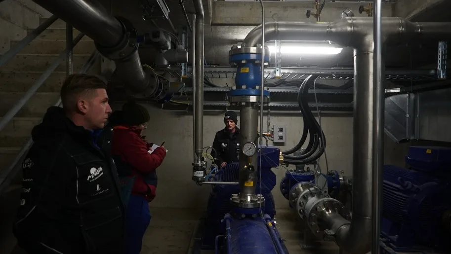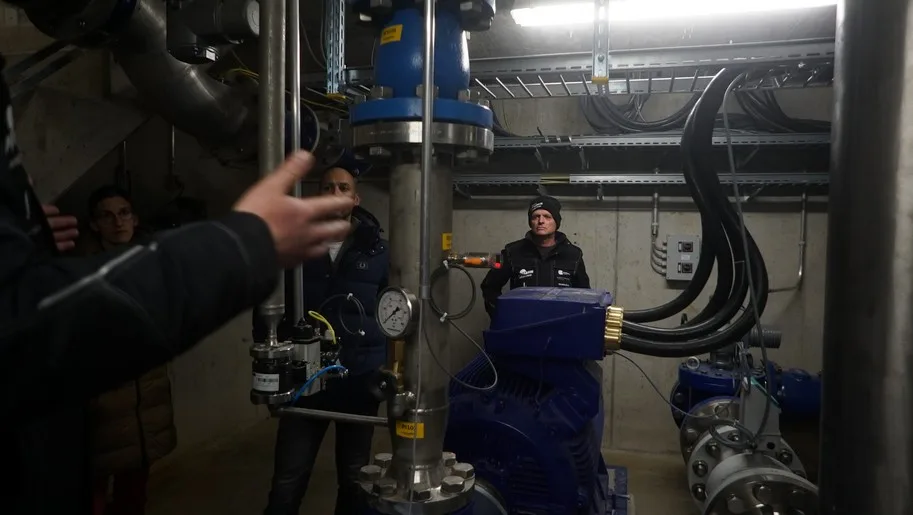 Das Wasser stammt aus zwei Bächen, wird zuerst gefiltert und gelangt dann in die Kühltürme. Während der Schneeproduktion wird es von den zwei Pumpen auf den Berg befördert. Im kleinen Pumphäuschen steigt die Temperatur beträchtlich. Ab 20 Grad schaltet sich eine neu installierte Lüftung ein, die kalte Luft von außen auf die Pumpen bläst und die heiße Luft absaugt.