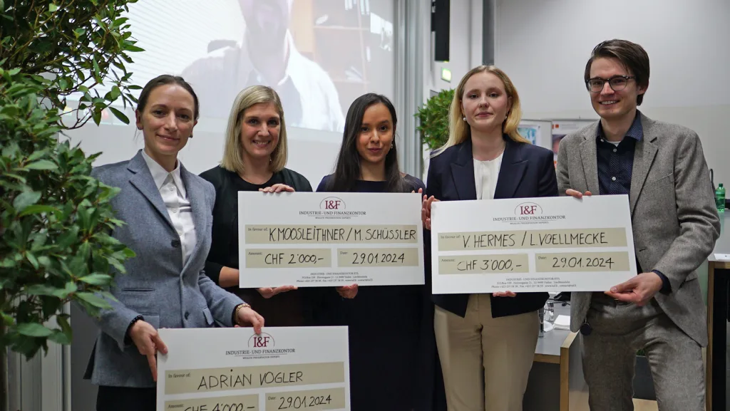 Für die Auszeichnung haben sich fünf Studenten qualifiziert. Ihre Arbeiten überzeugten durch einen hohen Praxisbezug und wissenschaftliche Expertise. Sie wurden durch I.D. Gisela Bergmann, Prinzessin von und zu Liechtenstein, CEO und geschäftsführende Verwaltungsrätin von Industrie- und Finanzkontor, und S.D. Prinz Michael von und zu Liechtenstein ausgezeichnet. Die Preisträger sind: