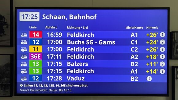 Derzeit sorgt die Sperrung des Schaaner Riet für massive Verkehrsbehinderungen in und um Schaan. Autofahrer weichen auf die überlastete Zollstrasse aus, was zu enormen Staus führt. Diese Verkehrssituation wirkt sich auch auf den öffentlichen Verkehr aus. Am Montagabend waren Busse teilweise bis zu 60 Minuten verspätet. LIEmobil reagierte umgehend.