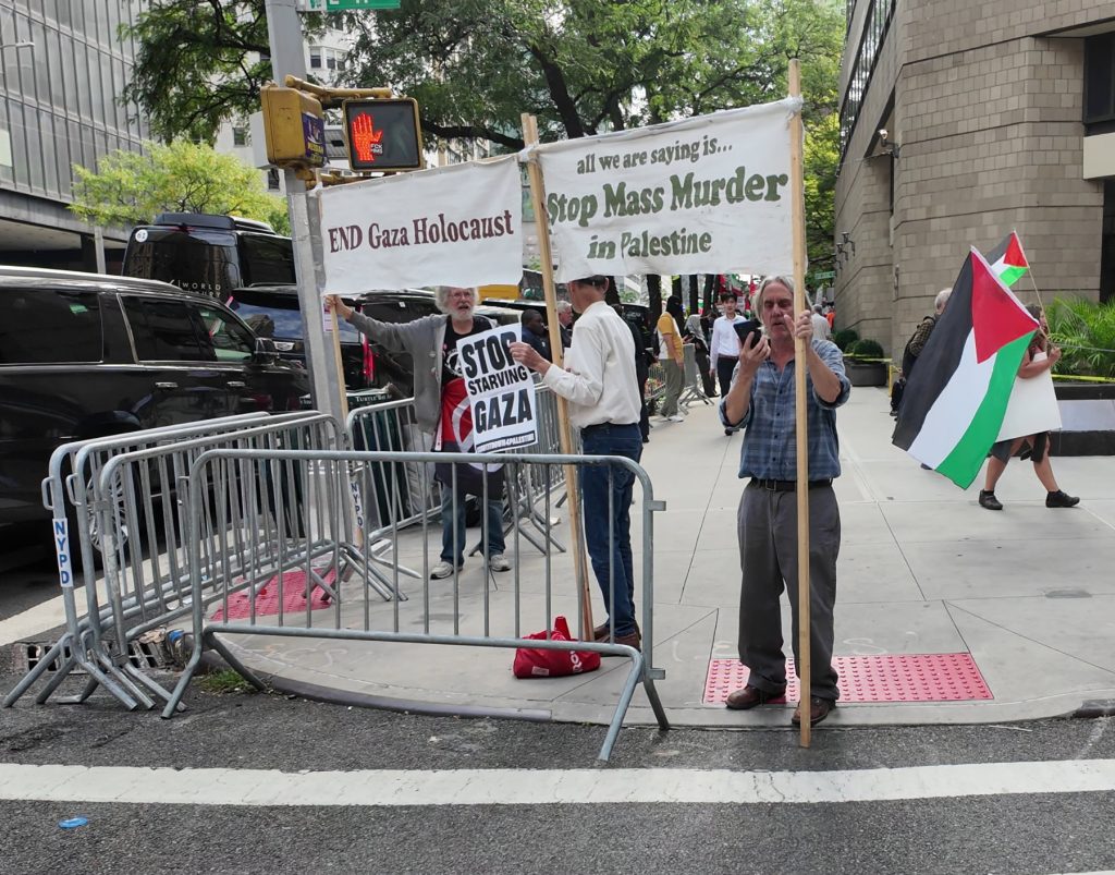 Während drinnen Diplomaten verhandeln, protestieren draussen Aktivisten. Pro-Palästina-Demonstranten säumen die Strassen rund um das UN-Gebäude. Ihre Plakate und Sprechchöre sind unüberhörbar.