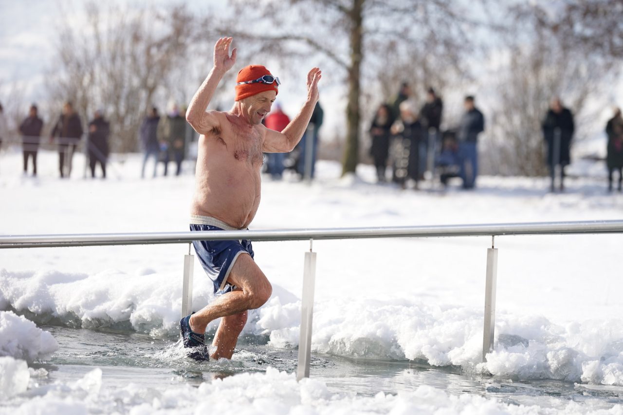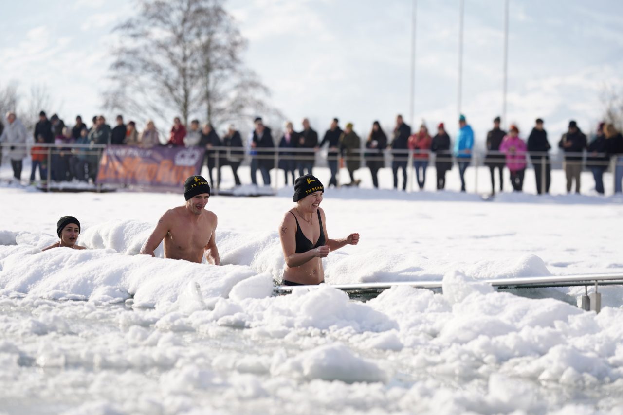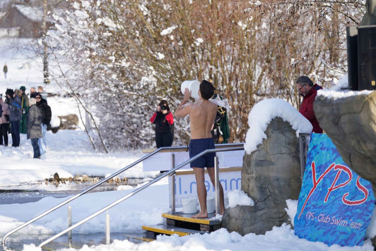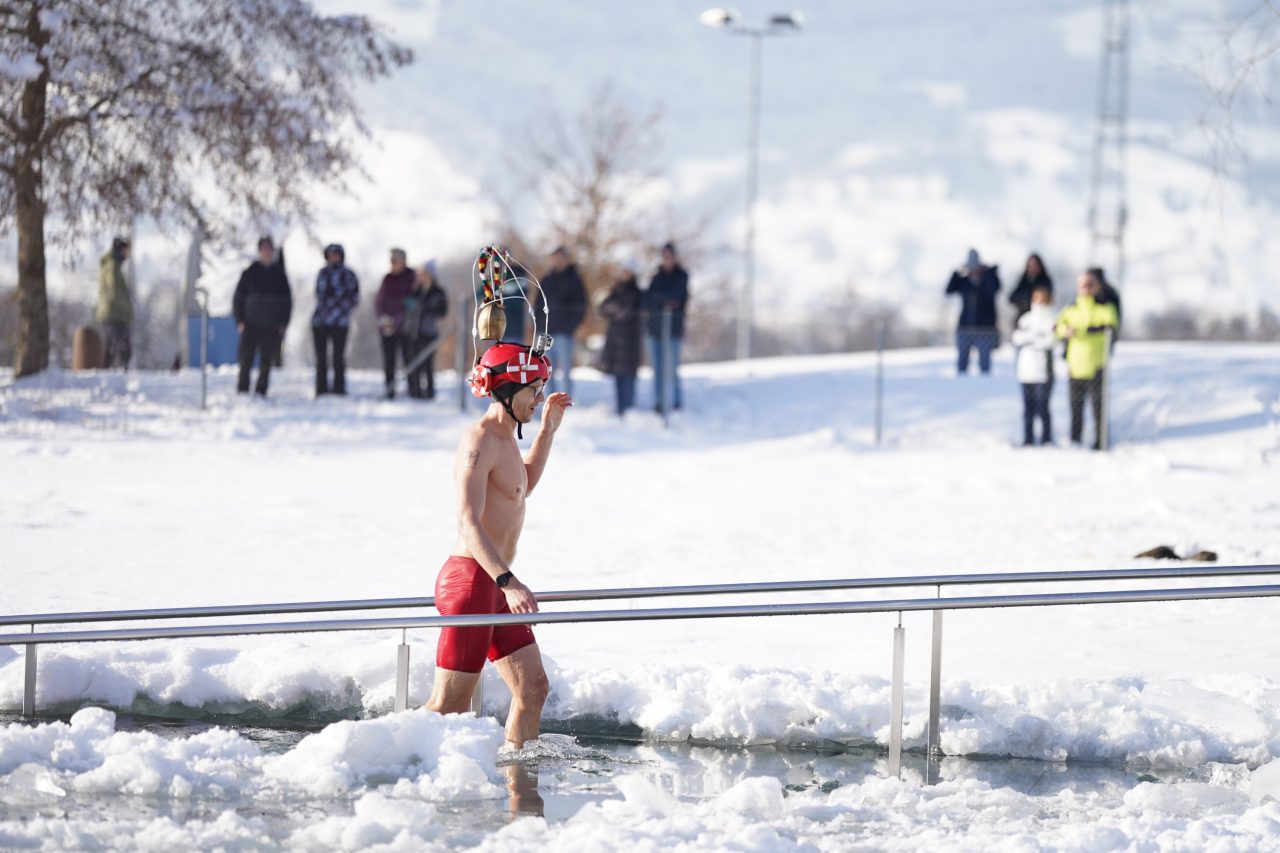 In der Nacht hatte es noch kräftig geschneit, was der Landschaft ein märchenhaftes Winterkleid verlieh. Doch pünktlich zum Start am Mittag zeigte sich das Wetter von seiner besten Seite: Strahlend blauer Himmel und Sonnenschein sorgten für perfekte Rahmenbedingungen – zumindest über Wasser. Im Wasser hingegen wartete eine echte Herausforderung: Bei einer Temperatur von nur 3,5 Grad erforderte der Sprung in die Grossabündt viel Überwindung.