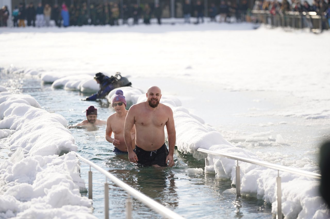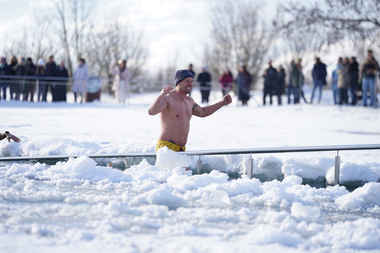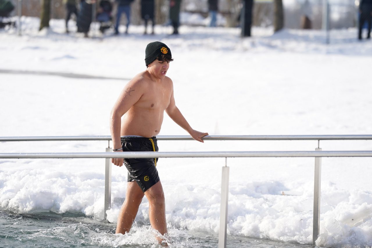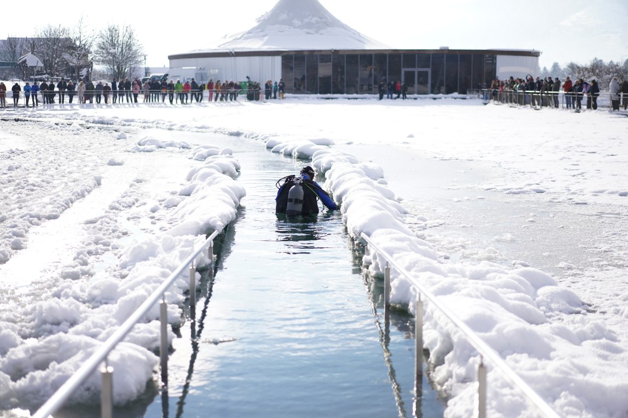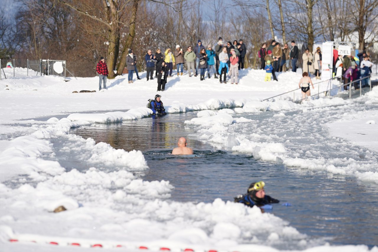 In der Nacht hatte es noch kräftig geschneit, was der Landschaft ein märchenhaftes Winterkleid verlieh. Doch pünktlich zum Start am Mittag zeigte sich das Wetter von seiner besten Seite: Strahlend blauer Himmel und Sonnenschein sorgten für perfekte Rahmenbedingungen – zumindest über Wasser. Im Wasser hingegen wartete eine echte Herausforderung: Bei einer Temperatur von nur 3,5 Grad erforderte der Sprung in die Grossabündt viel Überwindung.