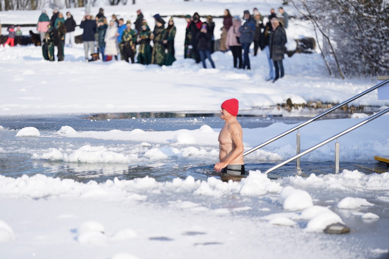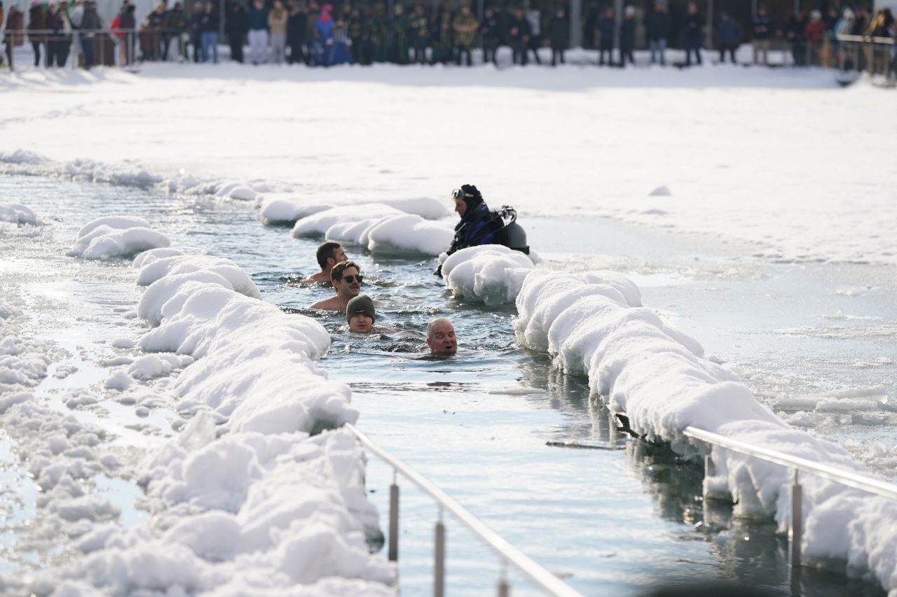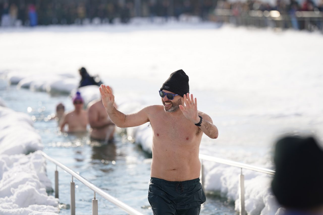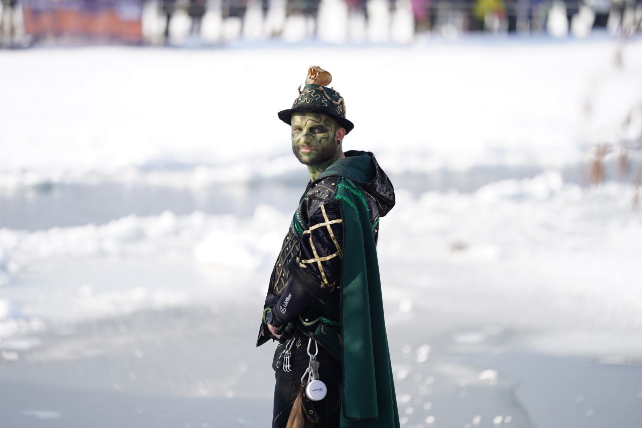 In der Nacht hatte es noch kräftig geschneit, was der Landschaft ein märchenhaftes Winterkleid verlieh. Doch pünktlich zum Start am Mittag zeigte sich das Wetter von seiner besten Seite: Strahlend blauer Himmel und Sonnenschein sorgten für perfekte Rahmenbedingungen – zumindest über Wasser. Im Wasser hingegen wartete eine echte Herausforderung: Bei einer Temperatur von nur 3,5 Grad erforderte der Sprung in die Grossabündt viel Überwindung.