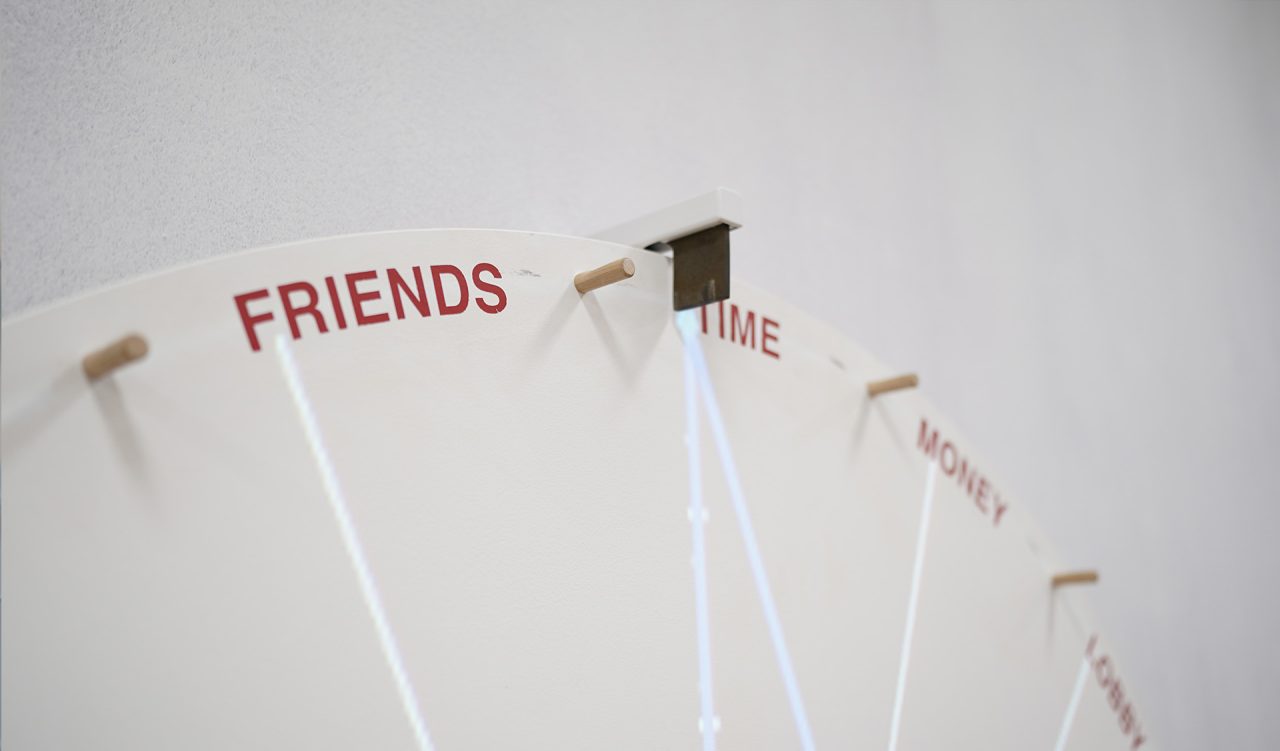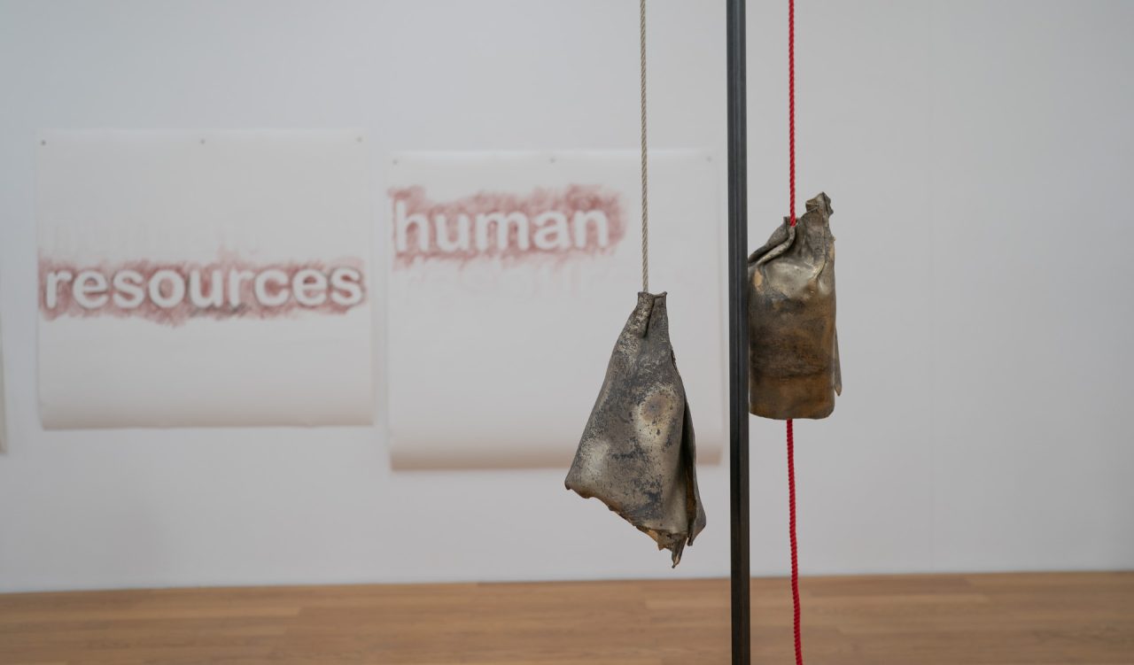 Ein zentrales Thema der Ausstellung ist der Wert menschlicher Arbeit. Die Installation «Human Resources» beschäftigt sich mit dem ökonomisch-sozialwissenschaftlichen Begriff, der Menschen als «zur Verfügung stehendes Leistungspotenzial» definiert. Bereits 2016 in der Kunsthausgarage Aarau gezeigt, erscheint die Arbeit nun in veränderter Form: Nicht mehr als durchgestrichene Gegenüberstellung, sondern als Begriff, der sich auflöst und neu formiert.