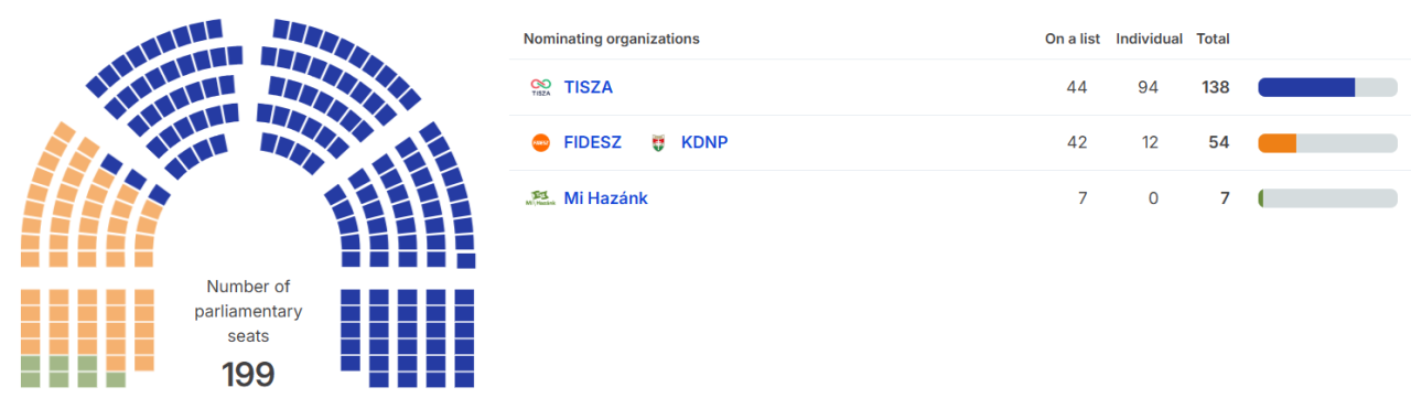Der Absturz von Fidesz ist dramatisch. Bei den letzten Parlamentswahlen 2022 hatte die Partei noch 135 Mandate gewonnen und die Zweidrittelmehrheit souverän verteidigt. Nun steht sie bei 54 Sitzen – ein Verlust von mehr als 80 Mandaten. Besonders verheerend sind die Ergebnisse in den Einzelwahlkreisen: Dort, wo der Kandidat mit den meisten Stimmen direkt einzieht, hat TISZA nach aktuellem Stand 95 der 106 Direktmandate gewonnen. Fidesz kommt auf 11.